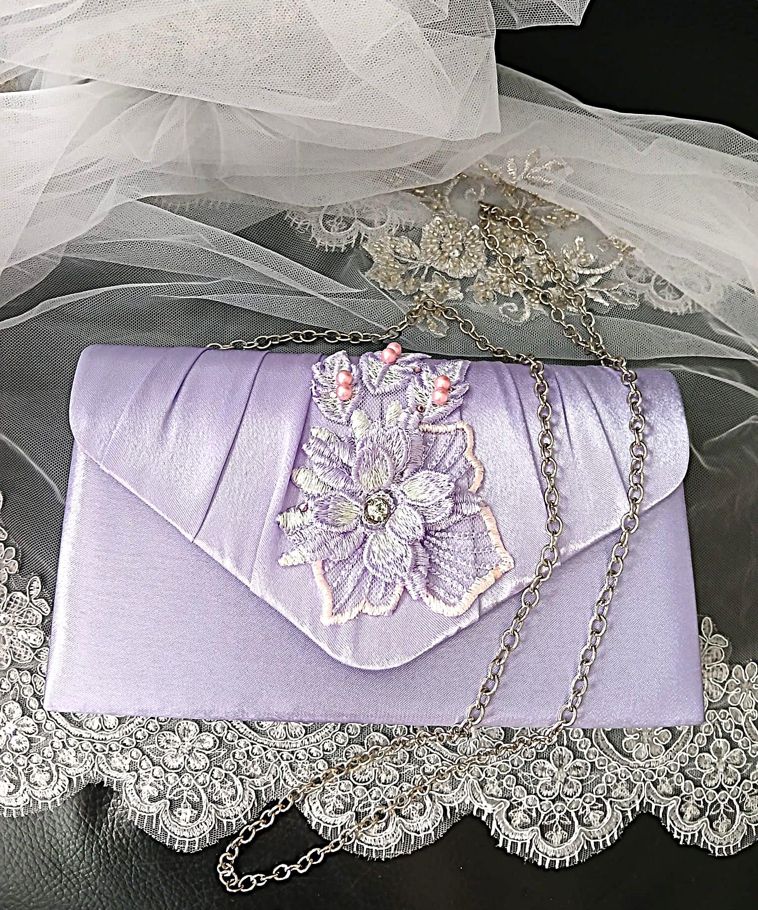 The front features a pleated envelope flap decorated with embroidered floral appliqué, lace-inspired detailing, and delicate bead accents, creating a graceful focal point.